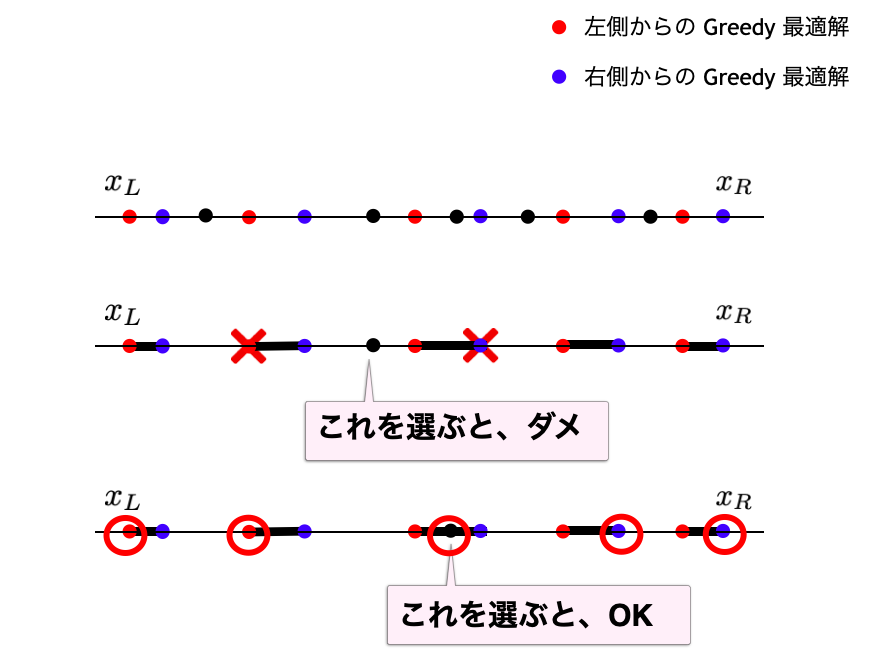 下図のように、左右両端からの Greedy 解が得られているとする。左からの Greedy 点の添字を とし、右からの Greedy 点の添字を (左から)